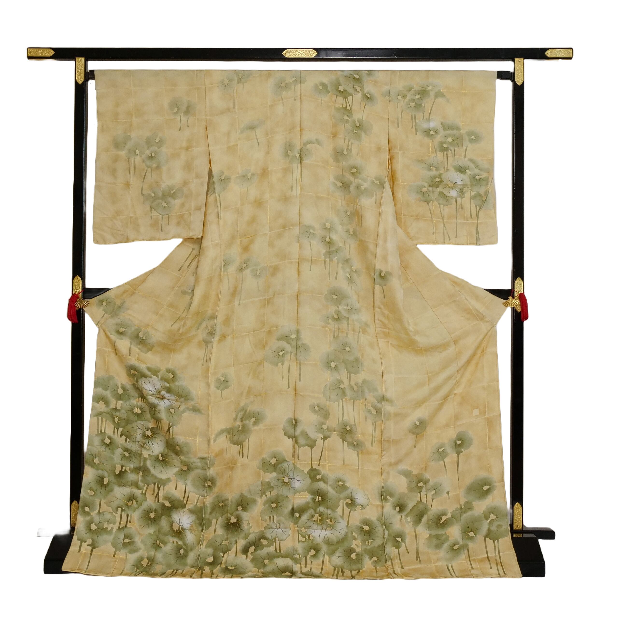 春の陽気の訪れを祝う蕗を金屏風に見立てて。「子どもの頃、春になると畑など辺りにどこかしら自然と生えてくる蕗を摘んで佃煮にしてもらったそんな記憶を思い出します」と幼少の頃見た情景を懐かしんで制作された一着です。 秀硯作 仕立ては下記サイズ、またはお客様ご自身で計測いただいたサイズを元にお仕立ていたします。 サイズ表(cm) サイズ S M L 身丈 158 160 163 裄丈 64 66 68 袖丈 49 49 49 前幅 23 24 25 後幅 28 29 30 くりこし 3 3 3