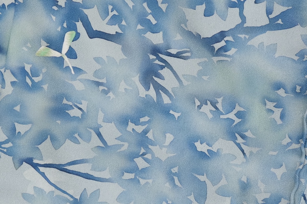 秋に赤く色づくまでの、春から夏にかけて新しく芽吹くもみじ。京都嵯峨清滝で見た情景からの着想。静かな山の清澄な空気を感じられる一着です。秀硯氏作