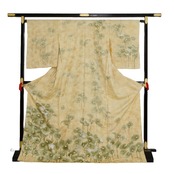 春の陽気の訪れを祝う蕗を金屏風に見立てて。「子どもの頃、春になると畑など辺りにどこかしら自然と生えてくる蕗を摘んで佃煮にしてもらったそんな記憶を思い出します」と幼少の頃見た情景を懐かしんで制作された一着です。